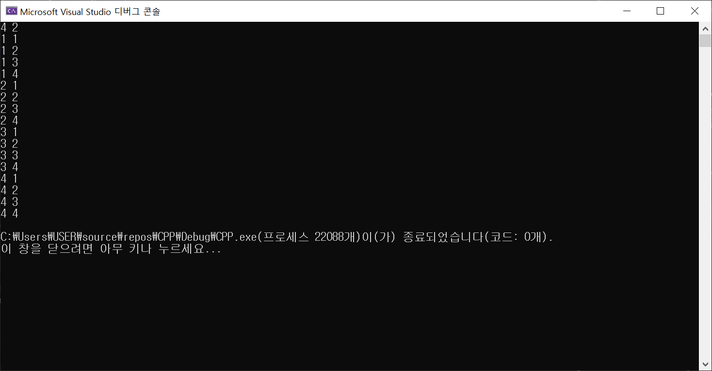 #include <iostream> #include <vector> #include <stack> #include <queue> #include <deque> #include <map> #include <algorithm> #include <string> #include <cstring> #include <climits> #include <random> #include <cmath> #include <set> #include <ctime> using namespace std; using ll = long long; using ii = pair<int, int>; int N, M; vector<int>arr; vector<int>visit(9); void DFS(int cnt) { if (cnt == M) { for (int i = 0; i < arr.size(); i++) cout << arr[i] << " "; cout << "\n"; return; } for (int i = 1; i <= N; i++) { visit[i] = 1; arr.push_back(i); DFS(cnt + 1); visit[i] = 0; arr.pop_back(); } } int main() { ios_base::sync_with_stdio(0); cin.tie(0), cout.tie(0); cin >> N >> M; DFS(0); return 0; }