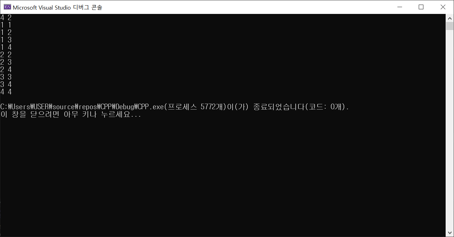 #include <iostream> #include <vector> #include <stack> #include <queue> #include <deque> #include <map> #include <algorithm> #include <string> #include <cstring> #include <climits> #include <random> #include <cmath> #include <set> #include <ctime> using namespace std; using ll = long long; using ii = pair<int, int>; int N, M; vector<int>arr; vector<int>visit(9); void DFS(int start, int cnt) { if (cnt == M) { for (int i = 0; i < arr.size(); i++) cout << arr[i] << " "; cout << "\n"; return; } for (int i = start; i <= N; i++) { visit[i] = 1; arr.push_back(i); DFS(i, cnt + 1); visit[i] = 0; arr.pop_back(); } } int main() { ios_base::sync_with_stdio(0); cin.tie(0), cout.tie(0); cin >> N >> M; DFS(1, 0); return 0; }